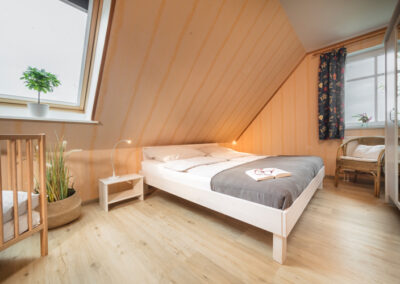 Schlafzimmer 3: 1 Doppelbett 180×200, Nachttische, mit Leselampe, Schlafsessel 90×200, Leselampe, Kinderbett 60×120, Wickelauflage, großzügiger Kleiderschrank mit Ganzkörperspiegel, Tisch mit Hocker, Insektenschutzgitter, Verdunklungsrollo