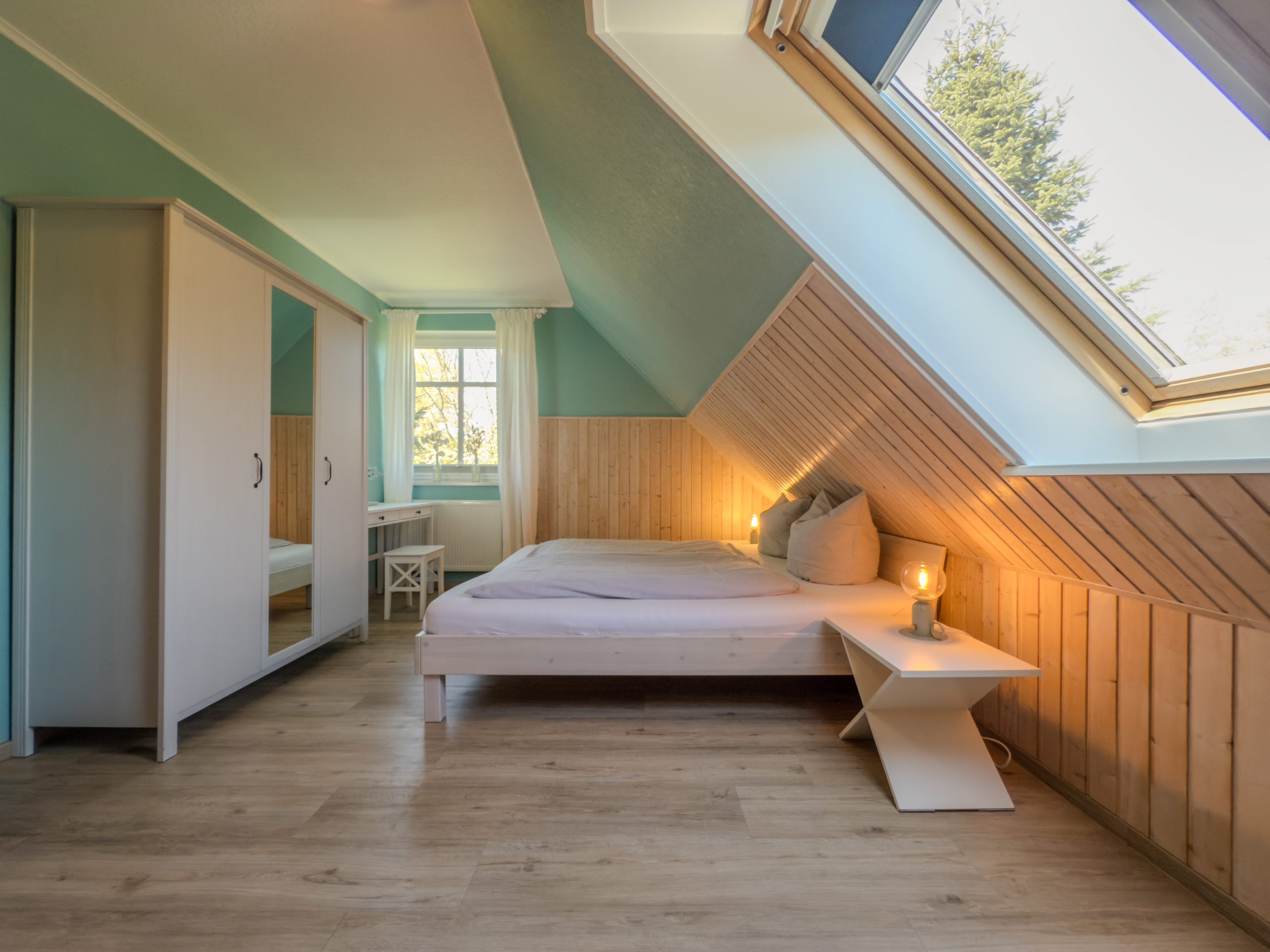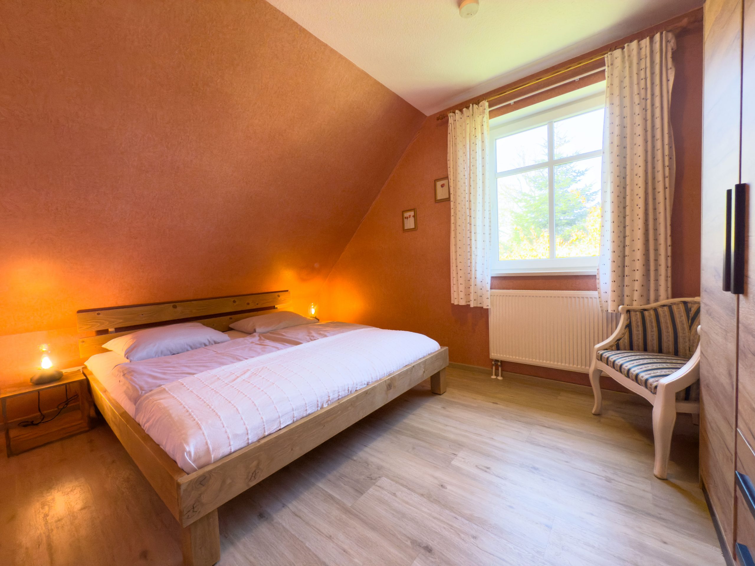 Schlafzimmer 1: 1 Doppelbett 180×200, Nachttische mit Leselampe, Kleiderablage, Fenster, mit Verdunklungsgardine, Insektenschutzgitter, geräumiger Kleiderschrank