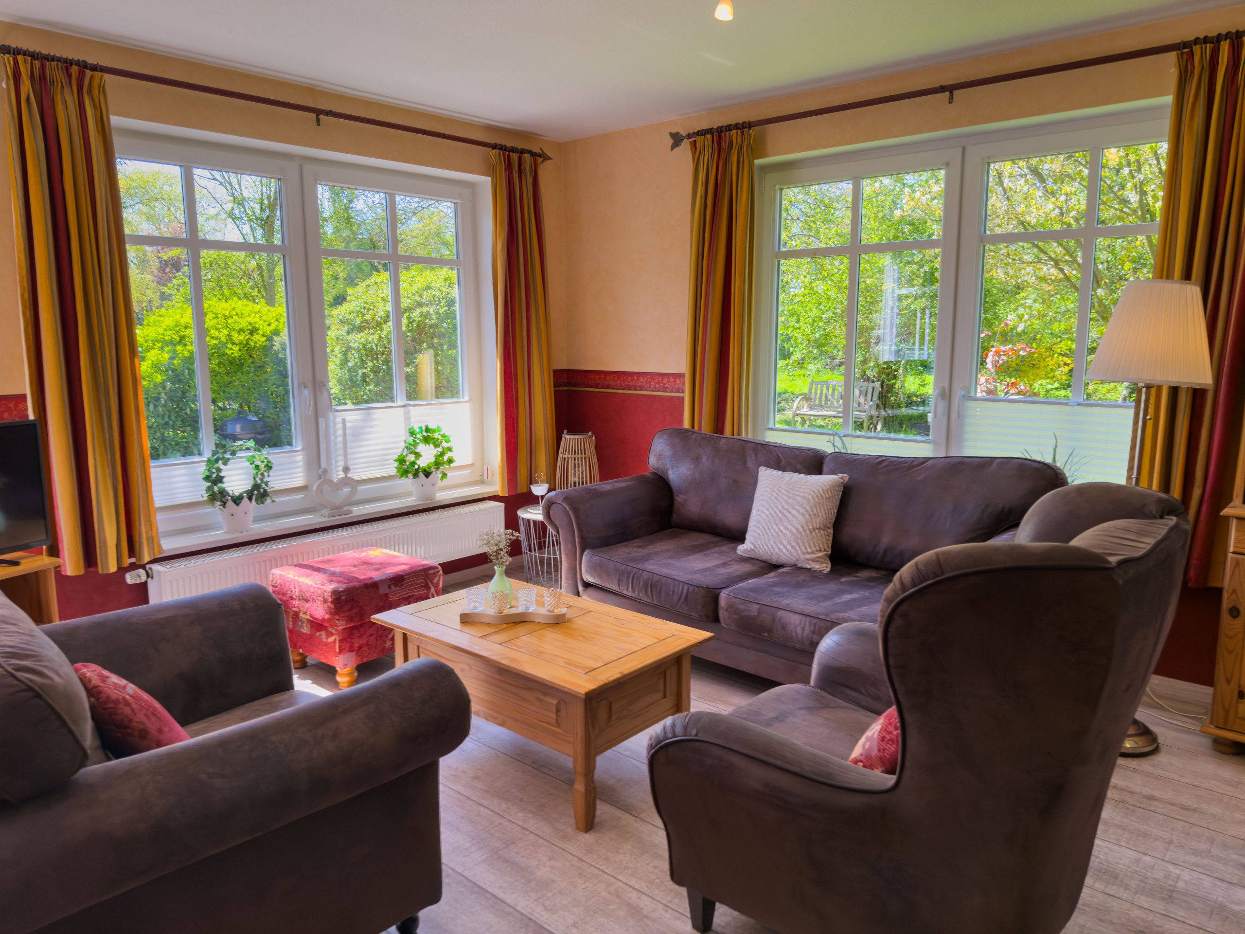 Mit Kaminofen, SAT-TV, Stereoanlage und Leseecke mit Büchern zum Schmökern.